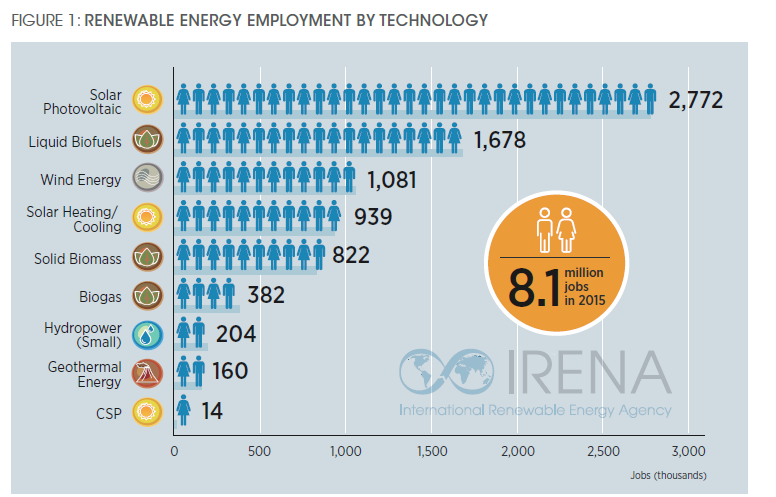 可再生能源行業(yè)細分領(lǐng)域就業(yè)人數(shù)概覽(資料來源:IRENA報告)