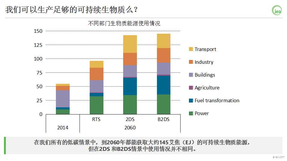 在2DS和B2DS情景中模擬生物質(zhì)能源的角色時(shí),考慮到能持續(xù)獲取的生物質(zhì)原料數(shù)量的限制,總的可獲取的生物質(zhì)供應(yīng)被限定在145 EJ。