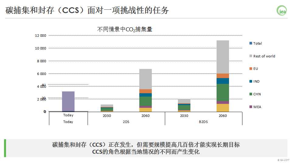 在2DS情景中,CCS在減少電力、工業(yè)和交通領(lǐng)域的碳排放中作用巨大。在2060年,每年將有大約70億噸的CO2被捕集。這與目前每年3000萬(wàn)噸的捕集量相比,是一個(gè)巨大的增長(zhǎng)。B2DS情景則更加依賴CCS,2060年需要每年捕集超過(guò)110億噸CO2。