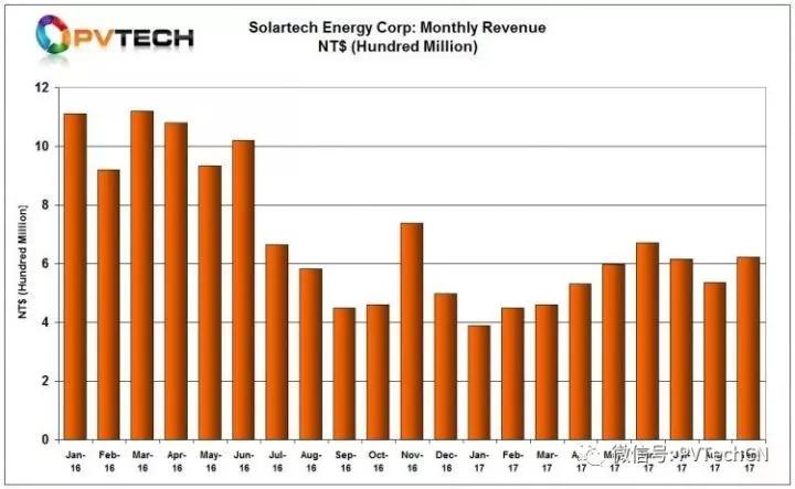 太陽能電池制造制造商升陽光電的月度銷售額自2017年初起即出現(xiàn)整體好轉(zhuǎn)。