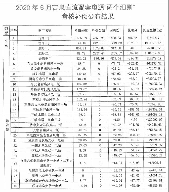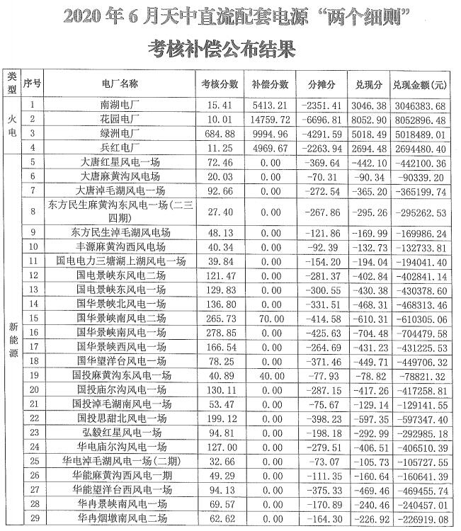 2020年6月新疆電網、天中、吉泉直流配套電源“兩個細則”考核補償結果