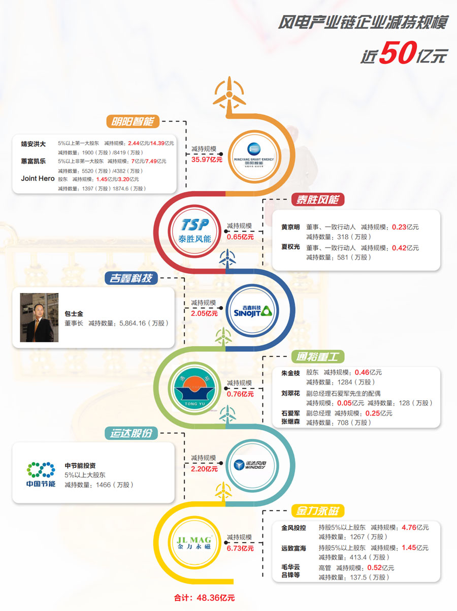 根據(jù)《能源》雜志記者統(tǒng)計(jì),國(guó)內(nèi)風(fēng)電主要上市公司中,包括明陽(yáng)智能、運(yùn)達(dá)股份、泰勝風(fēng)能、吉鑫科技、通裕重工、金力永磁在內(nèi),多家公司大股東、高管均在2020年制定大額減持計(jì)劃,減持規(guī)模近50億元,其中以明陽(yáng)智能減持規(guī)模最大。