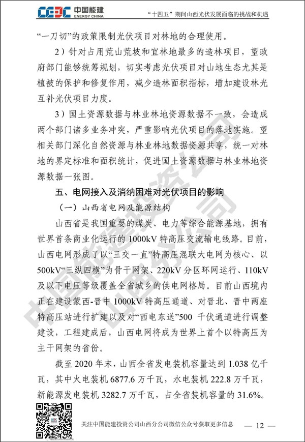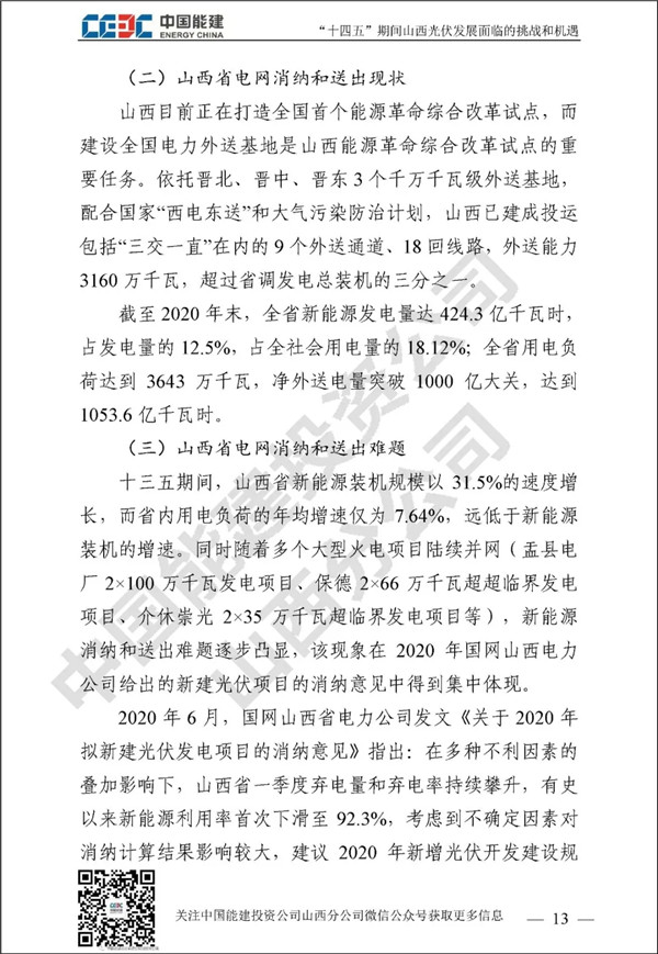 山西作為我國絕對的電力大省,“十三五”期間新能源發(fā)展成績矚目!疤歼_(dá)峰”和“碳中和”目標(biāo)對山西新能源行業(yè)發(fā)展既是挑戰(zhàn)更是機(jī)遇。中國能建投資公司山西分公司通過對諸多和光伏未來發(fā)展相關(guān)的政府規(guī)劃、行業(yè)政策、關(guān)鍵數(shù)據(jù)進(jìn)行歸納整理,并進(jìn)行分析研究,針對“土地和消納土地資源緊缺和電網(wǎng)消納困難”已經(jīng)成為光伏發(fā)展最大攔路虎這一行業(yè)