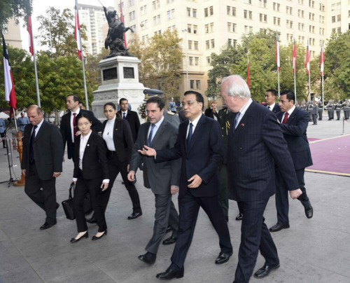 巴切萊特表示,李總理此訪具有歷史性意義,將有力推動智中關(guān)系在兩國建交45周年之際取得更大發(fā)展。智方愿同中方攜手打造兩國經(jīng)貿(mào)合作升級版,并為中國企業(yè)在智投資興業(yè)提供便利。共同挖掘礦業(yè)、可再生能源等領(lǐng)域產(chǎn)能合作潛力,歡迎中方參與“兩洋隧道”等基礎(chǔ)設(shè)施建設(shè)。拓展金融合作,將智利打造成人民幣在拉美清算中心。進一步加強農(nóng)牧業(yè)、科技創(chuàng)新合作、拓展文化、教育交流,將智中戰(zhàn)略伙伴關(guān)系全面推向前進。