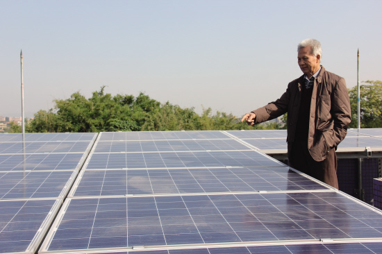 易先生在介紹他樓頂?shù)墓夥l(fā)電設(shè)施