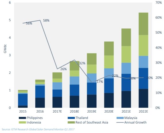 報(bào)告還強(qiáng)調(diào)泰國(guó)和馬來西亞等東南亞國(guó)家的潛在增長(zhǎng)機(jī)會(huì)。GTM預(yù)計(jì),由于慷慨和日益增加的清潔能源關(guān)稅,2017-2022年,泰國(guó)的新增太陽能容量將超4.6吉瓦。