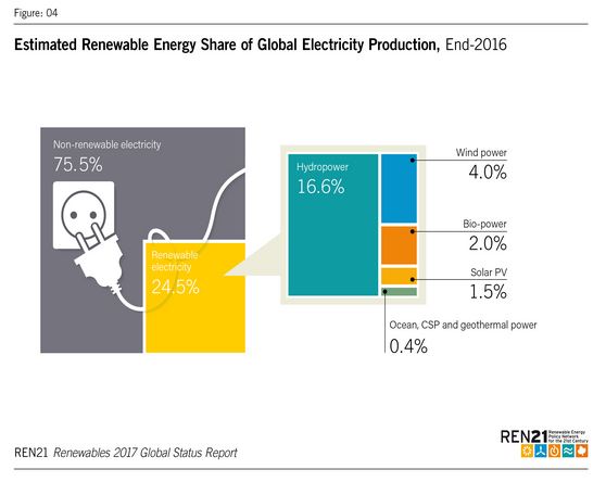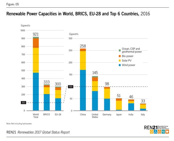 REN21在最新報(bào)告《2017年全球再生能源狀態(tài)報(bào)告》(GSR2017:Renewable 2017 Global Status Report)中指出,2016年,全球共新增了161GW的再生能源發(fā)電設(shè)備,其中47%為太陽(yáng)能,34%為風(fēng)力。至2016年底,全球再生能源累計(jì)裝機(jī)量達(dá)到2,017GW。累計(jì)裝機(jī)量最高的是中國(guó),達(dá)258GW;美國(guó)次之,為145GW。