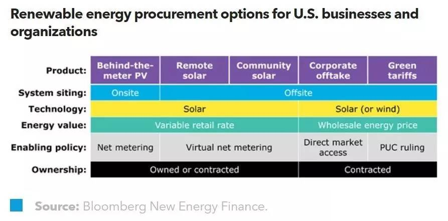 這種電力采購(gòu)從很多方面都有不同,比如對(duì)場(chǎng)地的需求、對(duì)政策支持的依賴、所有權(quán)結(jié)構(gòu)、是否受到電價(jià)波動(dòng)影響,以及實(shí)現(xiàn)技術(shù)多元化投資組合的能力等。由于這一系列的選擇,美國(guó)企業(yè)和機(jī)構(gòu)經(jīng)常采用“投資組合”的方法,綜合利用多種光伏產(chǎn)品。