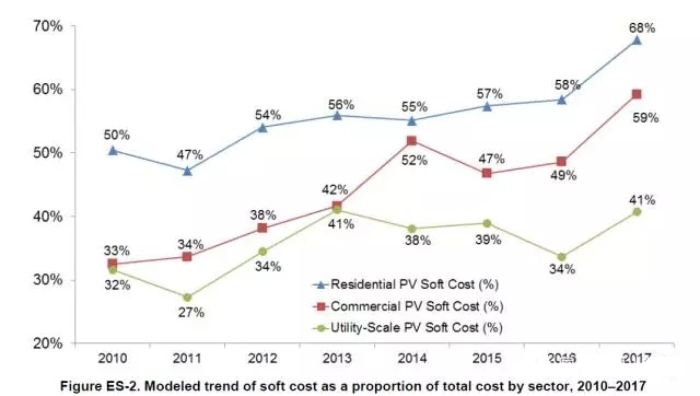 以公共事業(yè)級(jí)(大型地面)光伏為例,2010年軟成本只占總成本的32%,而2017年軟成本占到總成本的41%。2017年商用設(shè)施光伏系統(tǒng)的軟成本占59%,而家庭戶用光伏的軟成本比例更高達(dá)68%。