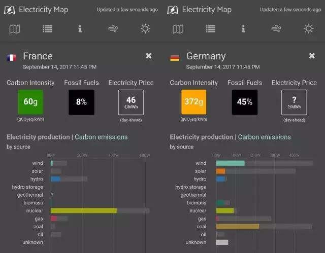 根據(jù)electricityma.ogp的實(shí)時(shí)顯示,在2017年9月14日當(dāng)?shù)貢r(shí)間11:45,德國(guó)的風(fēng)電光伏的發(fā)電量大約是法國(guó)的6倍,然而每發(fā)1千瓦時(shí)電德國(guó)的碳排放為372克,法國(guó)為60克,德國(guó)的發(fā)電碳強(qiáng)度也正好是法國(guó)的6倍。原因很簡(jiǎn)單:此時(shí)德國(guó)還有45%的化石燃料發(fā)電(主要是煤電),而法國(guó)的化石能源發(fā)電僅占8%。