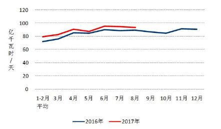 圖3 2016、2017年以來(lái)分月制造業(yè)日均用電量