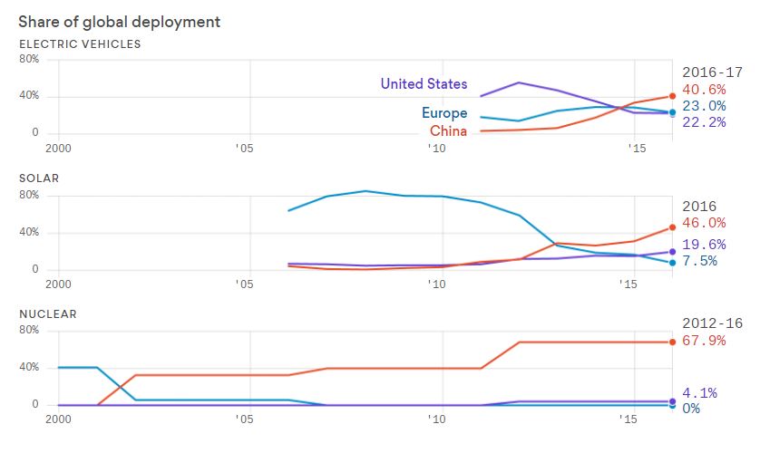 榮鼎咨詢(Rhodium Group)發(fā)現(xiàn),盡管美國(guó)政治家多年來(lái)警告稱,不能讓中國(guó)在清潔能源行業(yè)領(lǐng)先,但美國(guó)在電動(dòng)汽車、太陽(yáng)能和核能的部署方面已經(jīng)遠(yuǎn)遠(yuǎn)落后了。