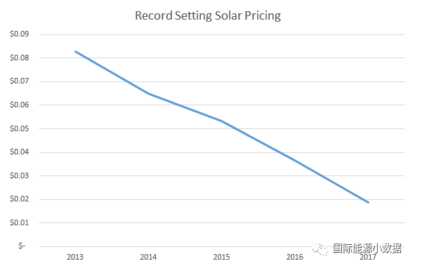 自從2013年美國(guó)光伏項(xiàng)目報(bào)出8.3美分/千瓦時(shí)的最低價(jià)格以來(lái),光伏最低價(jià)不斷被刷新:2014年阿聯(lián)酋項(xiàng)目報(bào)4.97美分/千瓦時(shí);2015年沙特項(xiàng)目報(bào)4.97美分/千瓦時(shí);2016年在沙特再度報(bào)出2.42美分/千瓦時(shí)。到目前為止,2017年在全世界各地的光伏競(jìng)標(biāo)中已經(jīng)有7個(gè)項(xiàng)目的報(bào)價(jià)低于2016年的最低報(bào)價(jià)。有國(guó)際專家預(yù)計(jì),按目前光伏成本趨勢(shì),2019年光伏最低報(bào)價(jià)可低至1美分/千瓦時(shí)。