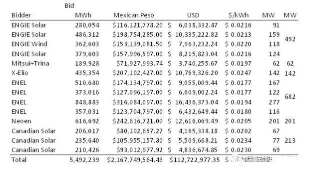 墨西哥能源部2.3吉瓦/5.5TWh(55億度,2020年入網(wǎng))光伏采購(gòu)競(jìng)標(biāo)結(jié)果日前出爐,意大利ENEL綠色電力公司報(bào)價(jià)1.77美分/千瓦時(shí)(相當(dāng)于人民幣0.11元/千瓦時(shí)),刷新不久前沙特阿拉伯1.79美分/千瓦時(shí)的光伏報(bào)價(jià)最低紀(jì)錄。在這次墨西哥的光伏項(xiàng)目競(jìng)標(biāo)中,其他公司(也包括中國(guó)公司)的平均報(bào)價(jià)為2.05美分/千