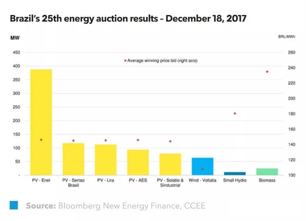 12月18日,巴西舉行了該國2017年的首輪逆向拍賣。本輪拍賣中的供電協(xié)議覆蓋多種發(fā)電技術(shù):生物質(zhì)、小型水電、風(fēng)電和光伏等多種發(fā)電項(xiàng)目。過去2年中,巴西電力拍賣市場一直死氣沉沉,本輪拍賣敲定的891MW項(xiàng)目終于散發(fā)出積極的市場信號。  具體來看,光伏在本輪拍賣中大獲全勝,共敲定了791MW的合同,平均成交價為1