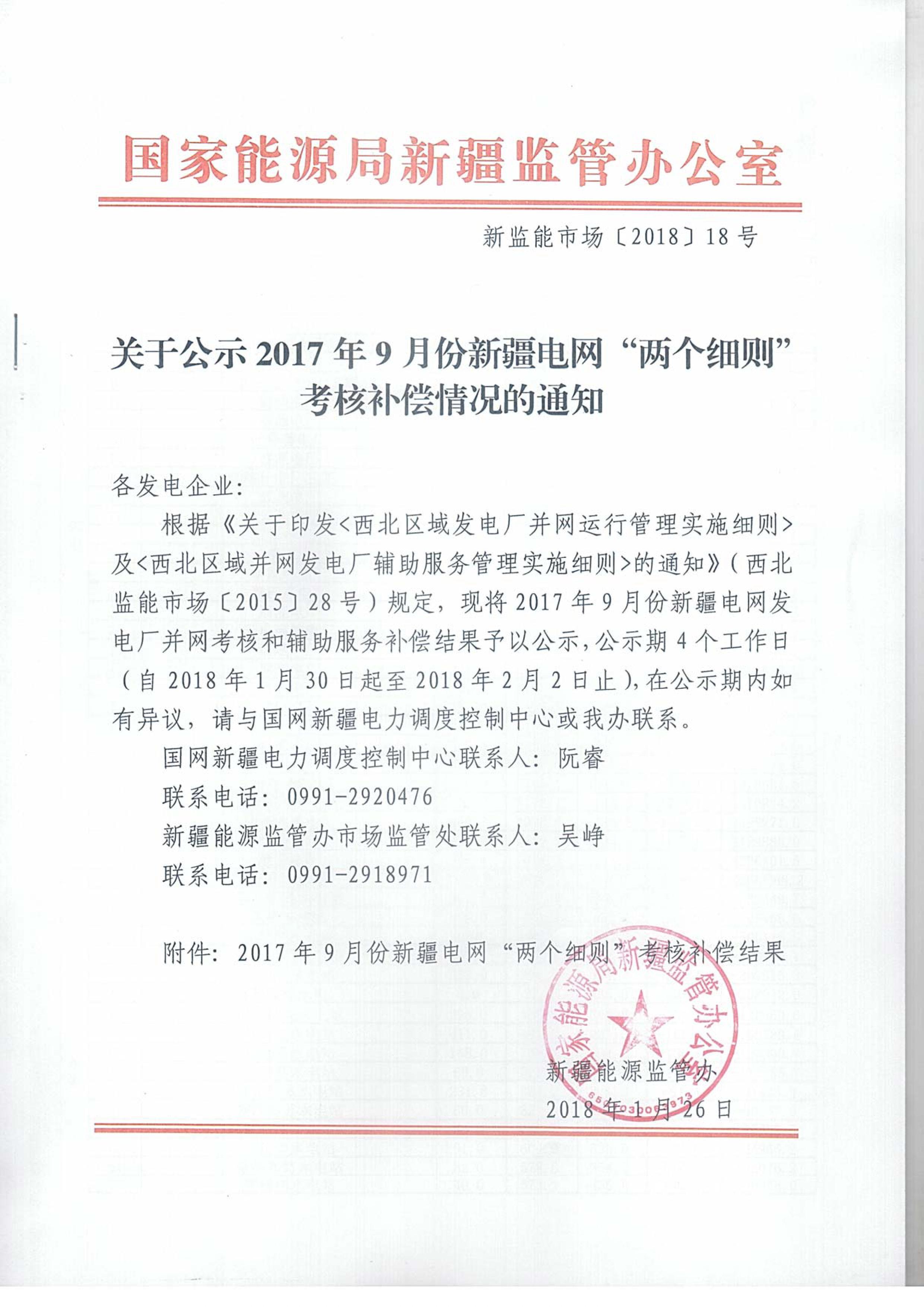 新疆能源監(jiān)管辦公示2017年9月份新疆電網(wǎng)“兩個(gè)細(xì)則”考核補(bǔ)償情況的通知。