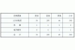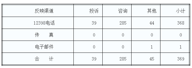 按反映渠道分類(lèi),12398電話(huà)368件,電子郵件1件。(2018年1月收到有效信息情況見(jiàn)表一)