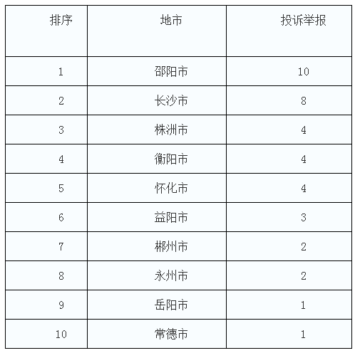 按照投訴舉報(bào)數(shù)量排序,邵陽(yáng)市、長(zhǎng)沙市、株洲市、衡陽(yáng)市、懷化市和益陽(yáng)市列轄區(qū)內(nèi)前6位。(2018年1月投訴舉報(bào)排名情況見(jiàn)表二)