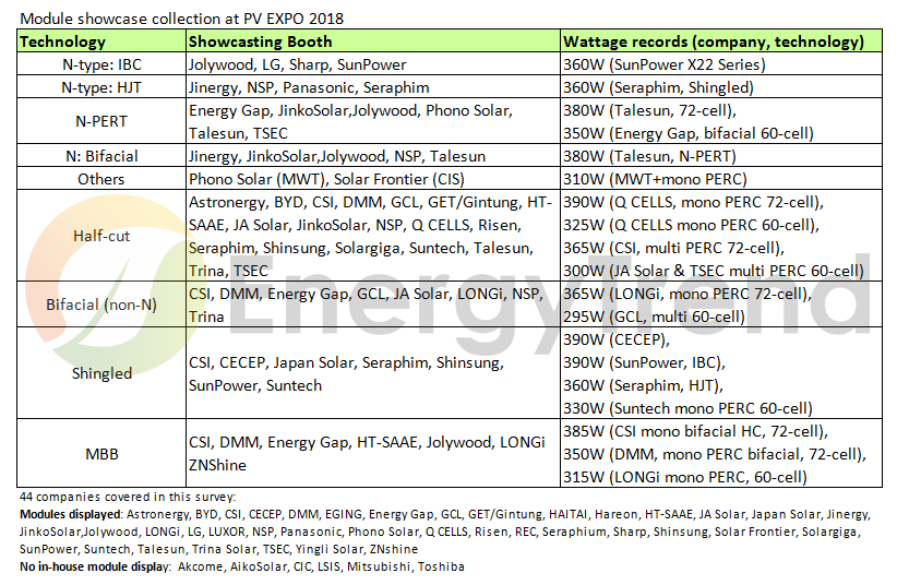 日本東京的PVEXPO是太陽(yáng)能產(chǎn)業(yè)每年第一個(gè)國(guó)際化的大型商展,從中可觀(guān)察到日本市場(chǎng)的氣氛、太陽(yáng)能發(fā)電的未來(lái)走勢(shì),以及每年度組件技術(shù)的發(fā)展方向。集邦咨詢(xún)旗下新能源研究中心集邦新能源網(wǎng)EnergyTrend在展會(huì)上統(tǒng)計(jì)44家代表性業(yè)者所展出的124款組件后,獲得以下結(jié)果: