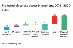 然而,到2020年中期,分布式技術(shù)將建立供應(yīng)鏈和更便宜的組件。此外,在那時(shí),電網(wǎng)擴(kuò)展和微電網(wǎng)之間的競(jìng)爭(zhēng)在經(jīng)濟(jì)上可行的區(qū)域?qū)⒏佟;谶@些假設(shè),彭博社團(tuán)隊(duì)認(rèn)為,到2030年,有2.38億戶家庭獲得電力供應(yīng),7200萬家庭將使用太陽能家庭系統(tǒng),3400萬家庭將從微電網(wǎng)獲取能源。