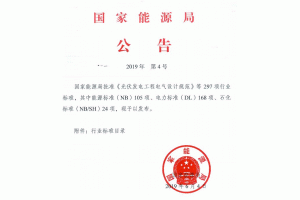 據(jù)國家能源局發(fā)布的2019年第4號公告,國家能源局批準(zhǔn)《光伏發(fā)電工程電氣設(shè)計規(guī)范》等297項行業(yè)標(biāo)準(zhǔn),其中,能源標(biāo)準(zhǔn)(NB)105項,電力標(biāo)準(zhǔn)(DL)168項,石化標(biāo)準(zhǔn)(NB\SH)24項。