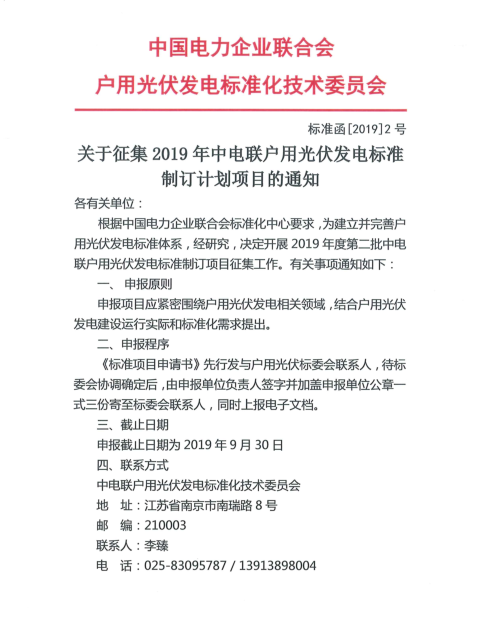 中電聯(lián)戶用光伏發(fā)電標(biāo)準(zhǔn)化技術(shù)委員會日前發(fā)布《關(guān)于征集2019年中電聯(lián)戶用光伏發(fā)電標(biāo)準(zhǔn)制訂計(jì)劃項(xiàng)目的通知》,對外公開征集2019年度第二批戶用光伏發(fā)電標(biāo)準(zhǔn)制訂項(xiàng)目,項(xiàng)目申報(bào)截止日期為2019年9月30日。