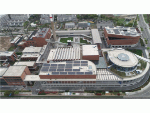 在城市文化廣場(chǎng)圖書館和文化中心的樓頂上,一排排整齊的太陽(yáng)能光伏板被安裝在空曠的平臺(tái)上。據(jù)悉,城市文化廣場(chǎng)光伏項(xiàng)目于2019年12月開始建設(shè),采用“自發(fā)自用,余電上網(wǎng)”的并網(wǎng)方式,是國(guó)網(wǎng)寧波市奉化區(qū)供電公司“泛江口清潔能源小鎮(zhèn)”節(jié)能建筑群項(xiàng)目中的一部分。