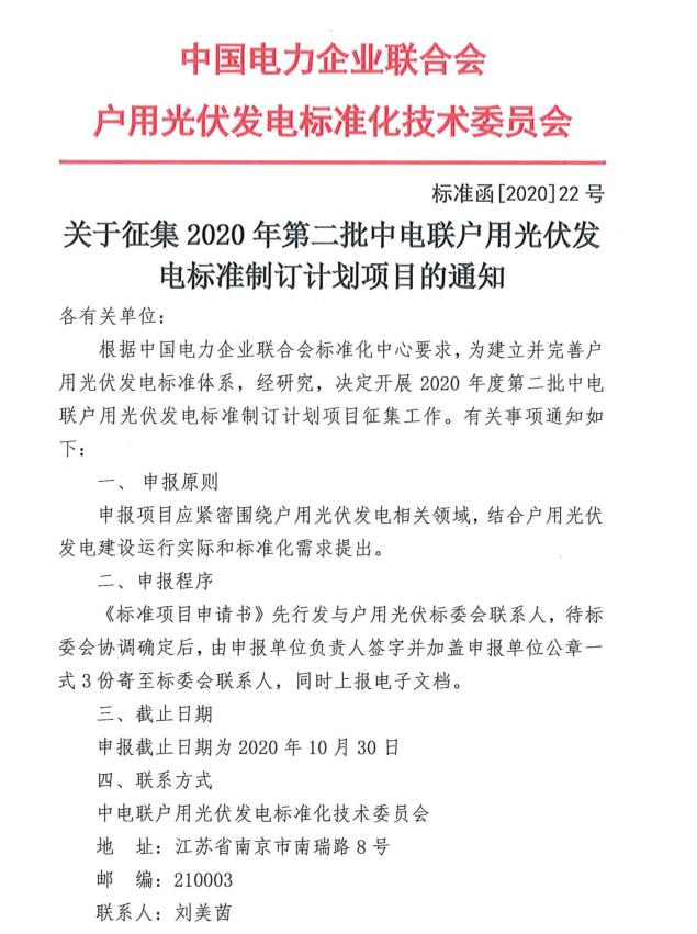 中電聯(lián):2020年度第二批戶用光伏發(fā)電標(biāo)準(zhǔn)制定計(jì)劃項(xiàng)目征集工作開始了