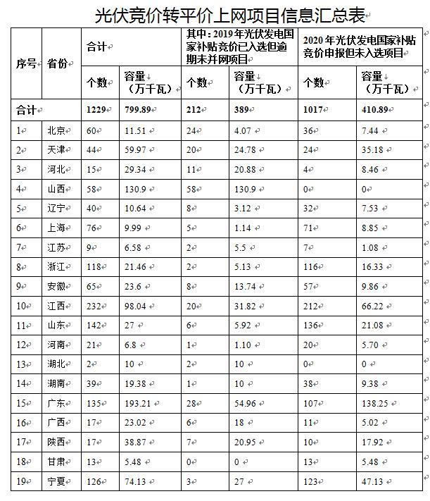 根據(jù)《國家能源局綜合司關(guān)于報送光伏競價轉(zhuǎn)平價上網(wǎng)項目的通知》要求,結(jié)合各省級能源主管部門報送項目信息,光伏競價轉(zhuǎn)平價上網(wǎng)項目共1229個、裝機(jī)規(guī)模799.89萬千瓦,現(xiàn)予公布。