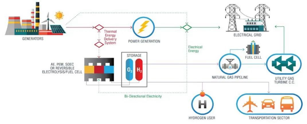 隨著電網(wǎng)的發(fā)展,各種可再生能源的滲透性越來越高,電網(wǎng)集成氫能相關(guān)技術(shù)可以提供儲(chǔ)能和其他電網(wǎng)功能:通過電解產(chǎn)生的氫氣可以作為一種雙向儲(chǔ)能載體,通過燃料電池或燃燒渦輪機(jī)等低排放發(fā)電技術(shù),按需將其轉(zhuǎn)換回電能;也可用于單向化學(xué)能源應(yīng)用,例如注入天然氣管道基礎(chǔ)設(shè)施,或作為原料生產(chǎn)氨或甲醇等增值商品;氫能技術(shù)還有穩(wěn)定電網(wǎng)電壓和頻率的輔助功能。