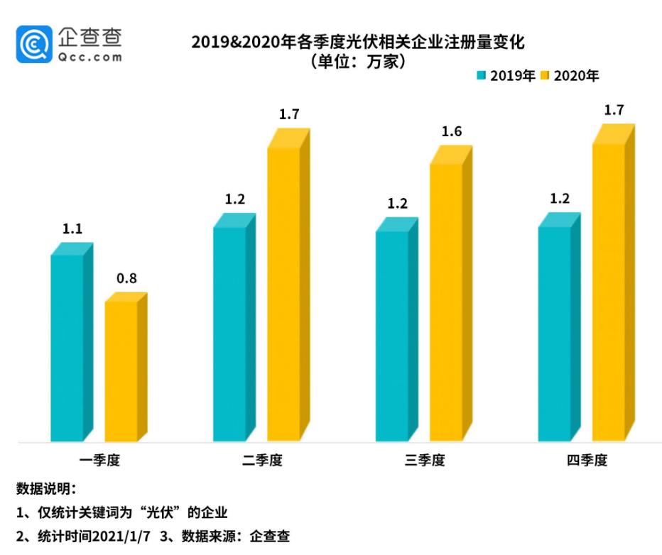 2020年,光伏產(chǎn)業(yè)在疫情之后迅速回暖。企查查數(shù)據(jù)顯示,一季度新注冊(cè)企業(yè)0.8萬家,低于上年同期,二三四季度注冊(cè)量均超過上年,其中四季度新注冊(cè)企業(yè)1.7萬家。