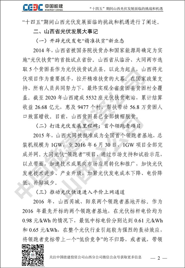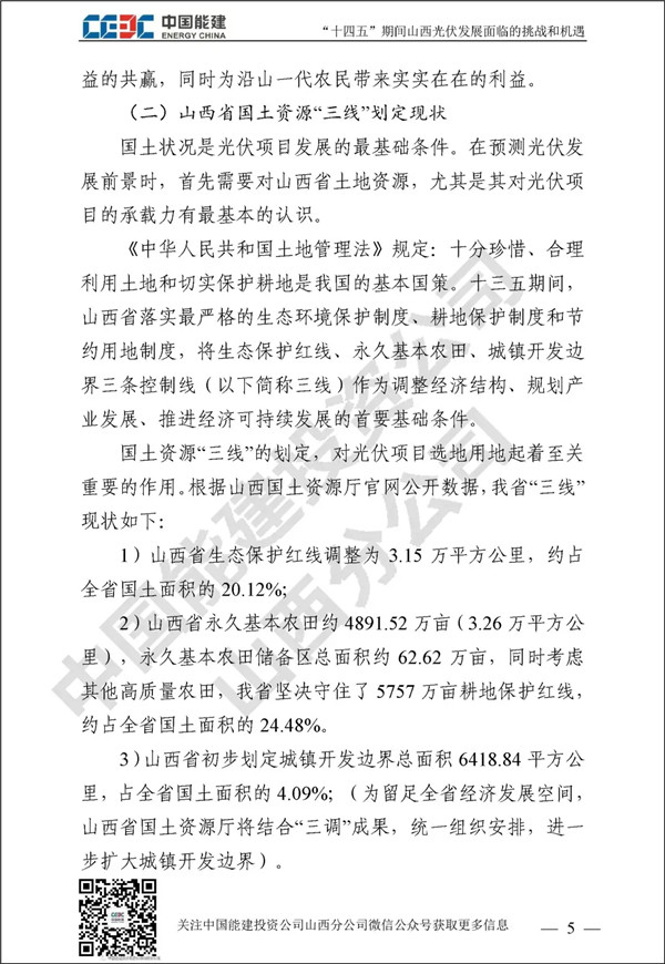 山西作為我國絕對的電力大省,“十三五”期間新能源發(fā)展成績矚目!疤歼_峰”和“碳中和”目標對山西新能源行業(yè)發(fā)展既是挑戰(zhàn)更是機遇。中國能建投資公司山西分公司通過對諸多和光伏未來發(fā)展相關(guān)的政府規(guī)劃、行業(yè)政策、關(guān)鍵數(shù)據(jù)進行歸納整理,并進行分析研究,針對“土地和消納土地資源緊缺和電網(wǎng)消納困難”已經(jīng)成為光伏發(fā)展最大攔路虎這一行業(yè)
