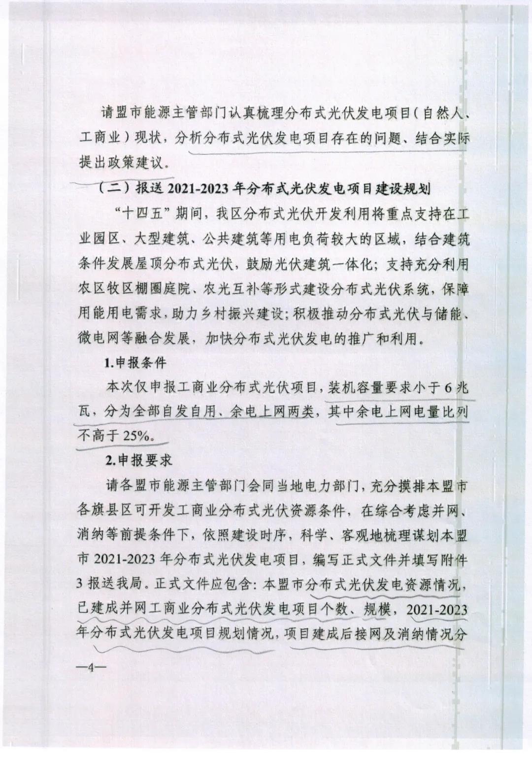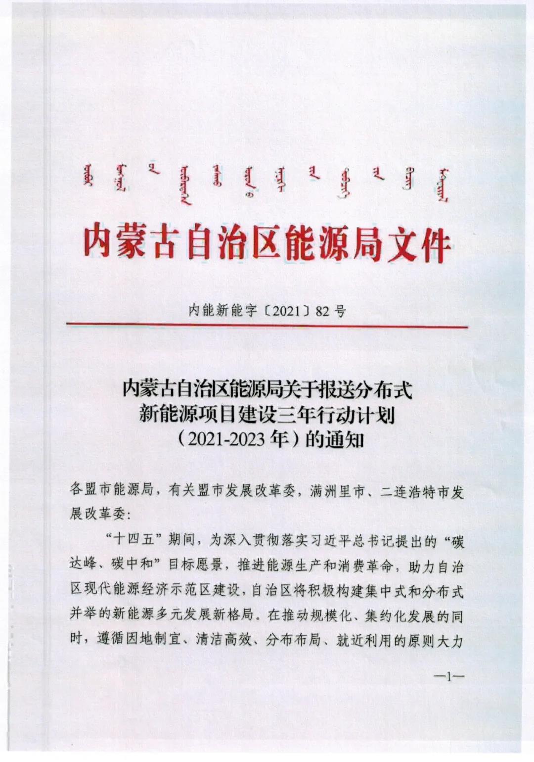 日前,內(nèi)蒙古自治區(qū)能源局發(fā)布關(guān)于報送分布式新能源項目建設(shè)三年行動計劃(2021-2023年)的通知,文件要求,各盟市能源主管部門全面梳理分布式新能源項目的發(fā)展現(xiàn)狀,并結(jié)合實際梳理申報2021-2021年分布式新能源開發(fā)建設(shè)規(guī)劃。