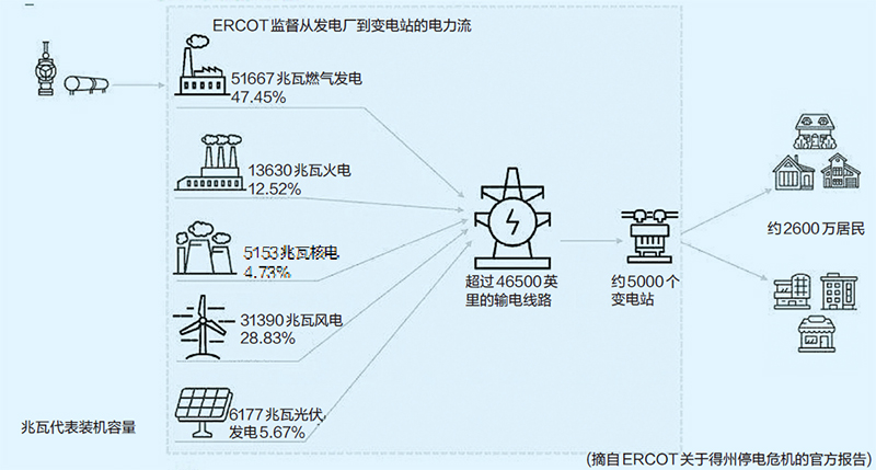 得州發(fā)電、輸電和配電概述(摘自ERCOT關于得州停電危機的官方報告)美國當?shù)貢r間2021年2月24日,得克薩斯州電力可靠性委員會(ER-COT)發(fā)布了關于得州停電危機的第一份官方報告。該報告介紹了ER-COT的基本情況,重點介紹了ERCOT在此次極端天氣事件之前的運行準備、信息溝通,還原了2月14日至2月16日的時間線,并披露了因為發(fā)