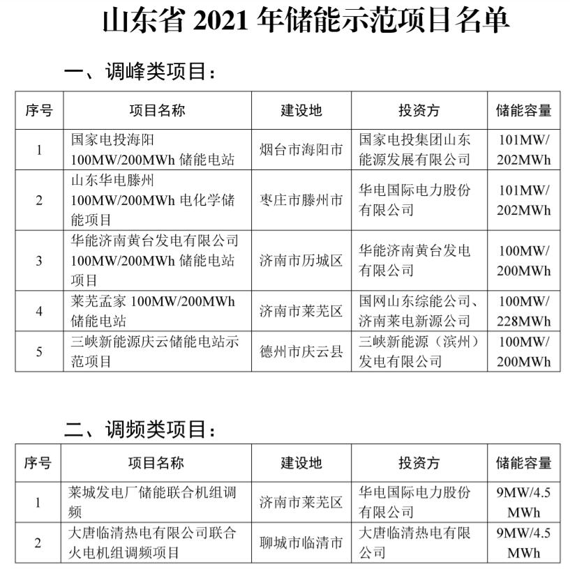 從山東省能源局獲悉:日前,山東省發(fā)展和改革委員會(huì)、 山東省能源局聯(lián)合印發(fā)關(guān)于公布2021年儲(chǔ)能示范項(xiàng)目的通知,確定國(guó)家電投海陽(yáng)100MW/200MWh儲(chǔ)能電站等5個(gè)調(diào)峰項(xiàng)目和萊城發(fā)電廠儲(chǔ)能聯(lián)合機(jī)組調(diào)頻等2個(gè)調(diào)頻項(xiàng)目為2021年儲(chǔ)能示范項(xiàng)目。