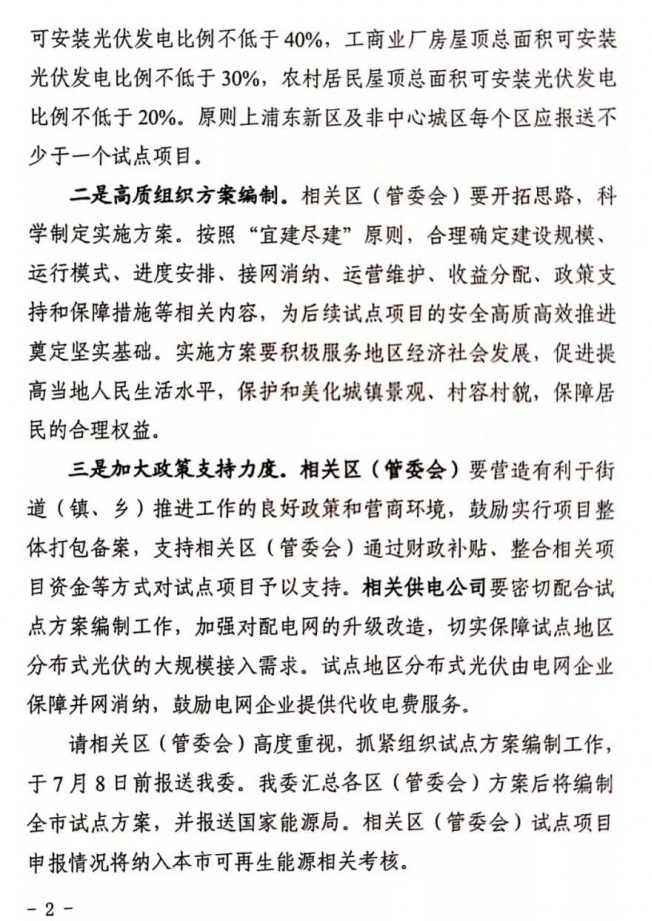 6月25日,上海發(fā)改委下發(fā)關(guān)于轉(zhuǎn)發(fā)《國家能源局綜合司關(guān)于報(bào)送整縣(市、區(qū))屋頂分布式光伏開發(fā)試點(diǎn)方案的通知》的通知,要求積極申報(bào)項(xiàng)目試點(diǎn),高質(zhì)組織方案編制,加大政策支持力度。