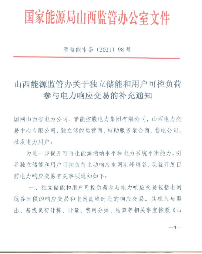 為進(jìn)一步提升可再生能源消納水平和電力系統(tǒng)平衡能力,引導(dǎo)獨(dú)立儲能和用戶可控負(fù)荷主動響應(yīng)電網(wǎng)削峰填谷,國家能源局山西監(jiān)管辦公室今日印發(fā)《關(guān)于獨(dú)立儲能和用戶可控負(fù)荷參與電力響應(yīng)交易的補(bǔ)充通知》,就開展日前電力響應(yīng)交易有關(guān)事項(xiàng)做出安排。通知全文如下: