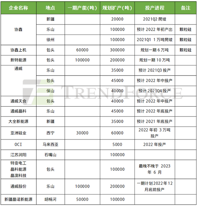 2021年硅料擴(kuò)產(chǎn)情況