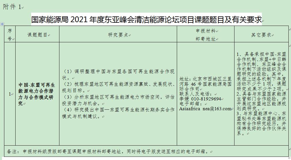 附件1 國(guó)家能源局2021年度東亞峰會(huì)清潔能源論壇項(xiàng)目課題題目及有關(guān)要求