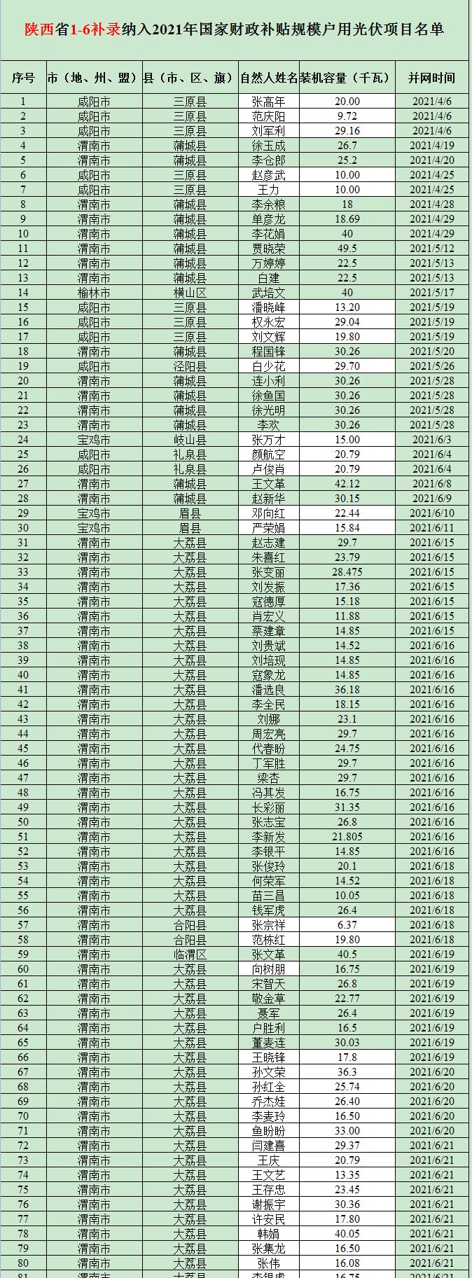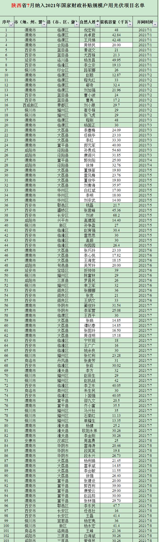 9日,陜西省能源局在官網(wǎng)上公示了“納入2021年7月國家財(cái)政補(bǔ)貼規(guī)模戶用光伏項(xiàng)目”,合計(jì)1.718297萬千瓦,其中包含了4月漏報(bào)(10戶,0.020747萬千瓦)、5月漏報(bào)(13戶,0.037754萬千瓦)、6月漏報(bào)(79戶,0.192214萬千瓦)