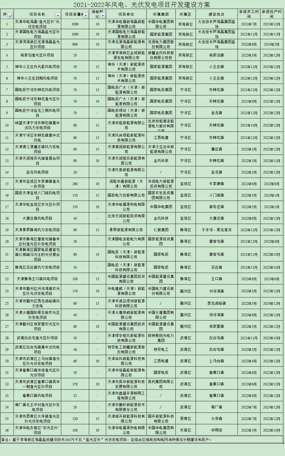 從天津市發(fā)改委獲悉:天津市發(fā)改委日前發(fā)布《關(guān)于天津市2021-2022年風(fēng)電、光伏發(fā)電項目開發(fā)建設(shè)方案的公示》,經(jīng)過各區(qū)組織申報、申報材料核查、電網(wǎng)消納分析、專家論證審核等程序,現(xiàn)將納入2021-2022年風(fēng)電、光伏發(fā)電項目開發(fā)建設(shè)方案的36個項目向全社會公示,共計36個。公示期自2021年8月9日至2021年8月16日。