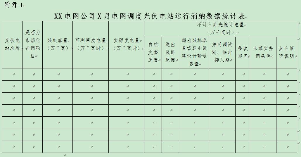 附件:1.XX電網(wǎng)公司X月電網(wǎng)調(diào)度光伏電站運(yùn)行消納數(shù)據(jù)統(tǒng)計(jì)表