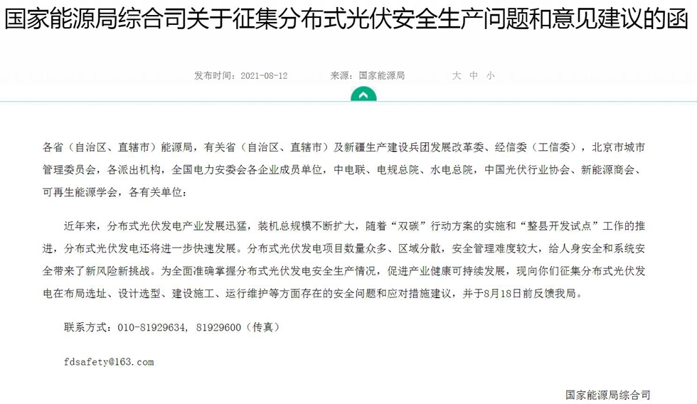 從國家能源局獲悉:8月13日,國家能源局印發(fā)《關(guān)于征集分布式光伏安全生產(chǎn)問題和意見建議的函》,為全面準確掌握分布式光伏發(fā)電安全生產(chǎn)情況,促進產(chǎn)業(yè)健康可持續(xù)發(fā)展,現(xiàn)向有關(guān)單位征集分布式光伏發(fā)電在布局選址、設(shè)計選型、建設(shè)施工、運行維護等方面存在的安全問題和應(yīng)對措施建議。建議函表示,近年來,分布式