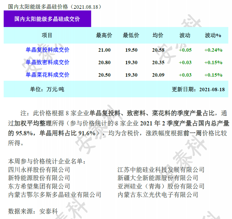 本周多晶硅價格整體持穩(wěn),個別散單和補單成交價小幅上漲,單晶復(fù)投料、單晶致密料、單晶菜花料成交均價漲幅都在0.3%以內(nèi)。本周一線大廠的復(fù)投料訂單主流成交價在20.7-20.8萬元/噸,其他企業(yè)主流成交價在20.0-20.5萬元/噸,最高價差達(dá)到1.5萬元/噸。