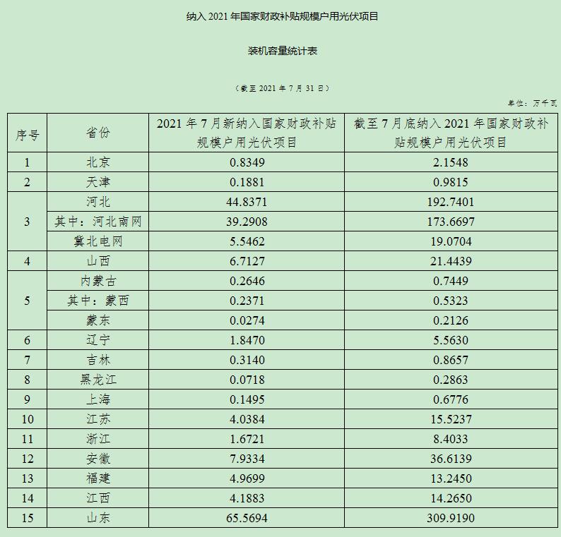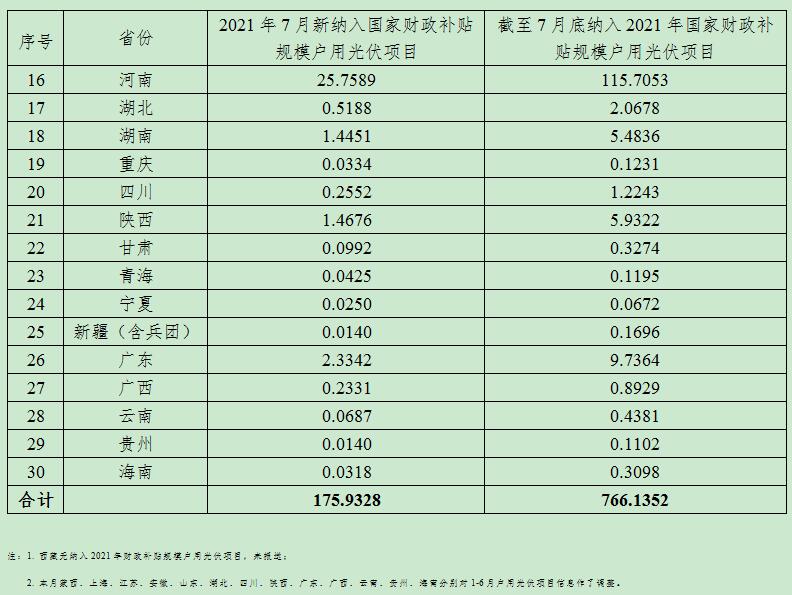 根據(jù)各省級(jí)能源主管部門(mén)、電網(wǎng)企業(yè)報(bào)送信息,經(jīng)國(guó)家可再生能源信息管理中心梳理統(tǒng)計(jì),2021年7月新納入國(guó)家財(cái)政補(bǔ)貼規(guī)模戶(hù)用光伏項(xiàng)目總裝機(jī)容量為175.93萬(wàn)千瓦。截至2021年7月底,全國(guó)累計(jì)納入2021年國(guó)家財(cái)政補(bǔ)貼規(guī)模戶(hù)用光伏項(xiàng)目裝機(jī)容量為766.14萬(wàn)千瓦。詳細(xì)情況見(jiàn)附表。