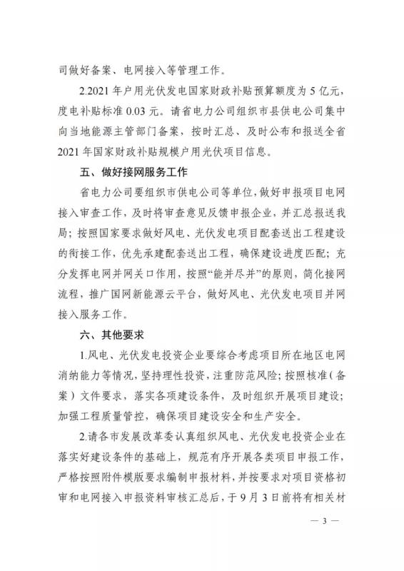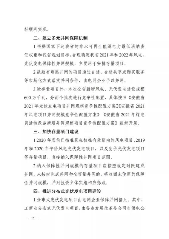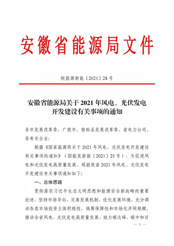 8月20日,安徽省能源局正式印發(fā)《關(guān)于2021年風(fēng)電、光伏發(fā)電開發(fā)建設(shè)有關(guān)事項(xiàng)的通知》,合理確定2021年和2022年風(fēng)電、光伏發(fā)電保障性并網(wǎng)規(guī)模,主要用于安排存量項(xiàng)目,明確2021年風(fēng)電、光伏新增規(guī)模為6GW,分別為光伏4GW、風(fēng)電1GW、煤電靈活性改造配置1GW。項(xiàng)目報(bào)送截止日期為9月3日。通知明確,2020年底前已核準(zhǔn)且在核準(zhǔn)有效期