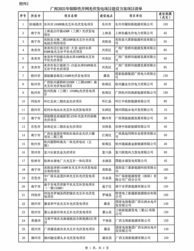 8月27日,廣西省能源局印發(fā)《關(guān)于2021年保障性并網(wǎng)陸上風(fēng)電和光伏發(fā)電項(xiàng)目建設(shè)方案的通知》。根據(jù)通知顯示,本次被納入2021年保障性規(guī)模的風(fēng)電、光伏項(xiàng)目有103個(gè),總規(guī)模為10.27GW。其中光伏項(xiàng)目共47個(gè),總規(guī)模為4660兆瓦,由21家企業(yè)開(kāi)發(fā)。以下為具體文件: