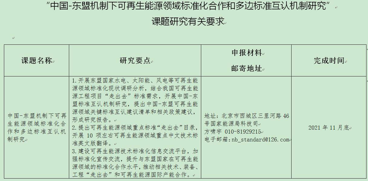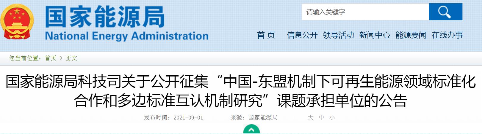 國家能源局科技司今日發(fā)布關于公開征集“中國-東盟機制下可再生能源領域標準化合作和多邊標準互認機制研究”課題承擔單位的公告,為做好“中國-東盟機制下可再生能源領域標準化合作和多邊標準互認機制研究”課題研究,根據(jù)國家能源局有關規(guī)定,從即日起開展研究課題承擔單位公開征集工作。申報時間為2021年9月1日至9月20日。