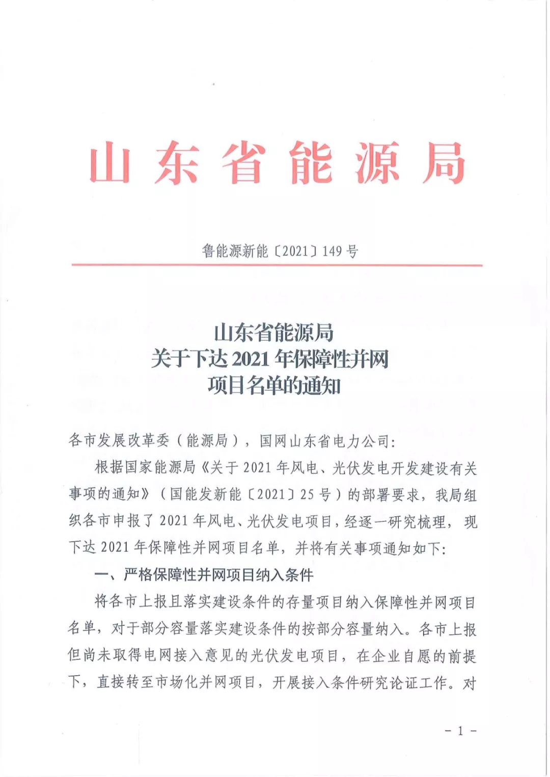 8月31日,山東省能源局下發(fā)《關(guān)于下達(dá)2021年保障性并網(wǎng)項(xiàng)目名單的通知》,公布了110個(gè)納入2021年保障性規(guī)模的項(xiàng)目,總規(guī)模約為544萬(wàn)千瓦。其中,光伏項(xiàng)目51個(gè),總規(guī)模約為236萬(wàn)千瓦;風(fēng)電項(xiàng)目59個(gè),總規(guī)模約為308萬(wàn)千瓦。