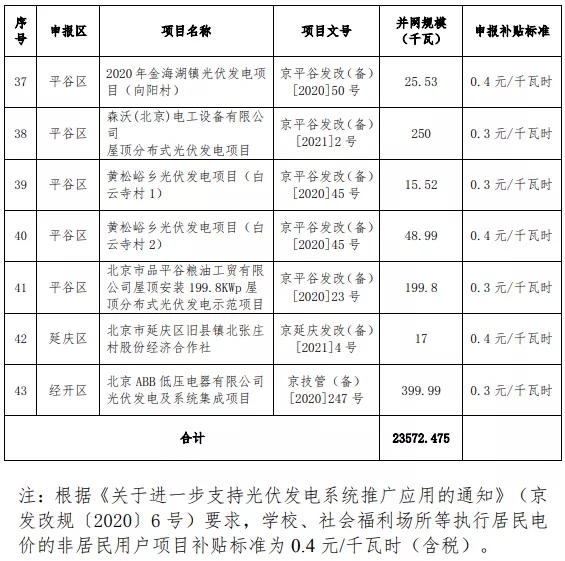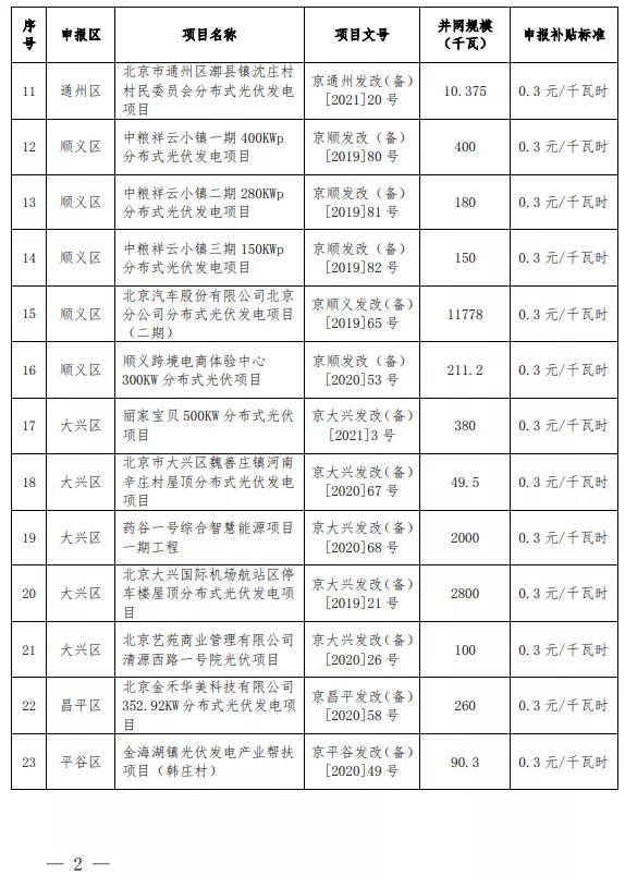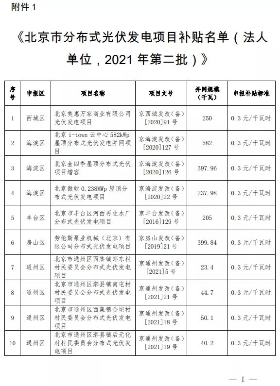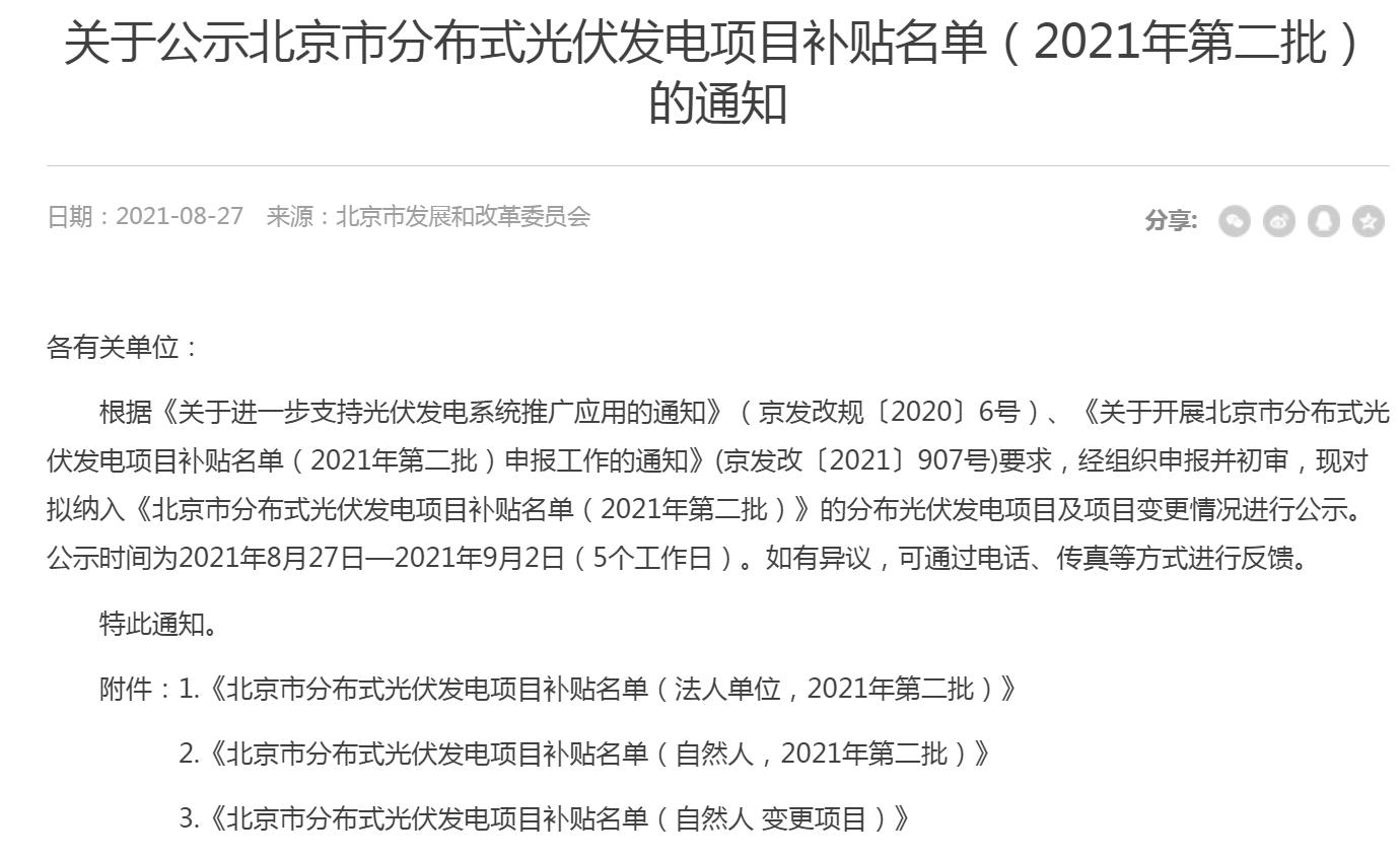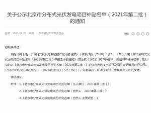 北京市2021年第二批分布式光伏發(fā)電項目補貼名單公布